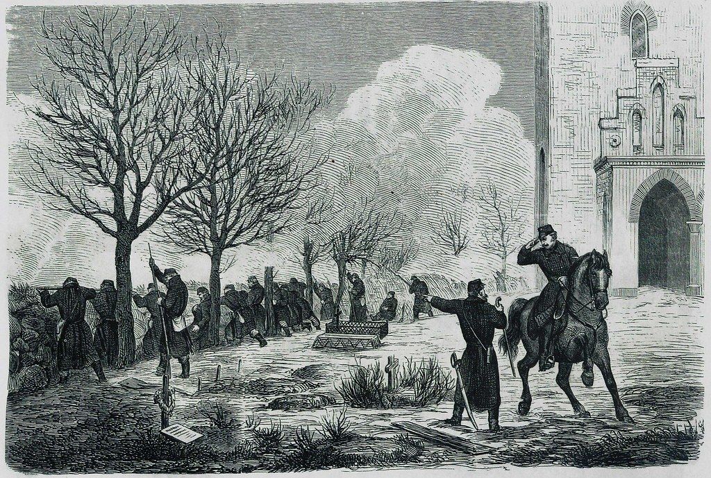 Dybbøl Kirke blev brugt af de danske styrker fra februar 1864 og frem til den 17. marts, hvor de danske forposter blev presset tilbage til skanserne. Herefter overtog preusserne kirketårnet. Det er forklaringen på, at der i dag findes både danske og preussiske efterladenskaber i træværket.